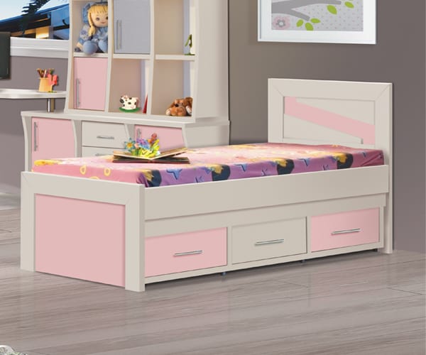 חדר ילדים מעוצב, כוורות שידות וארונות בעלי עיתורי חריטה בצורת קשת. החדר מכיל שולחן פינתי בעל פינות עגולות, שידת מגירות שידה נוספת עם שתי דלתות ומגירות, כוורת 9 תאים וארון מעוצב, על רגלי ניקל.